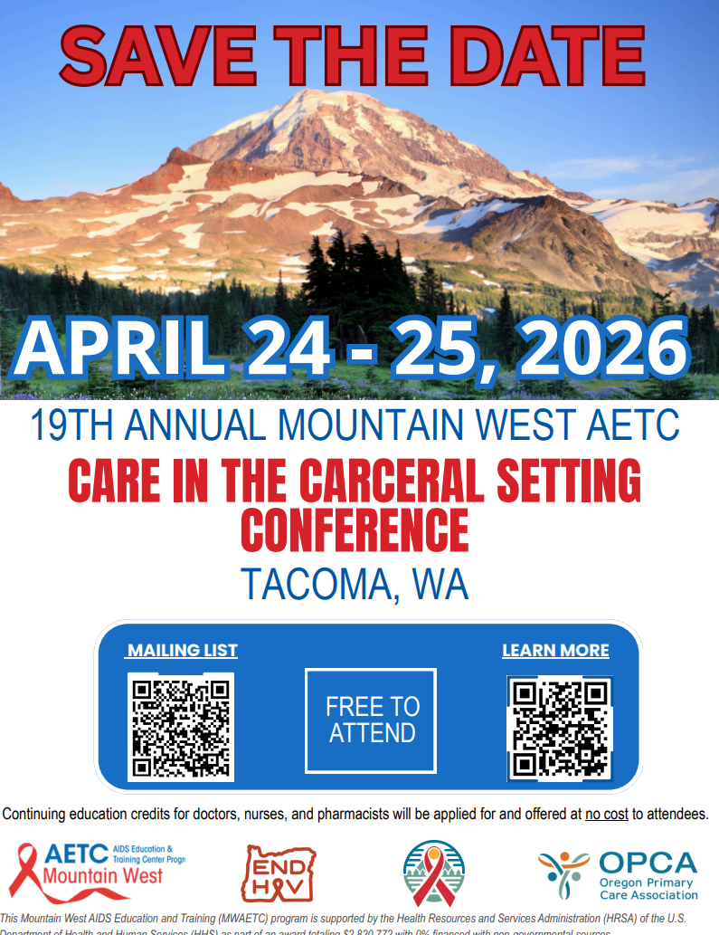 The 19th Annual MWAETC Care in the Carceral Setting Conference offers HIV/STI clinical updates and promising practices to increase efficiencies and support whole person health for individuals in the carceral settings in the ten state Mountain West region (Alaska, Washington, Oregon, Idaho, Montana, North Dakota, South Dakota, Wyoming, Colorado, and Utah). See content in right sidebar for details.
